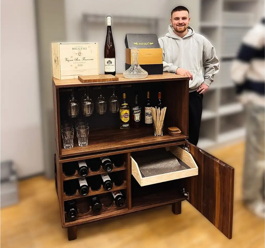 Der Weinschrank bietet viel Stauraum für Flaschen und Zubehör. Integriert sind ein Flaschenhalter sowie ein Weinglashalter. Hinter der Tür befindet sich ein Schubkasten, um Dinge wie Flaschenöffner, Untersetzer und Servietten unterzubringen. Der Oberboden eignet sich ideal zum Mixen von Getränken.
